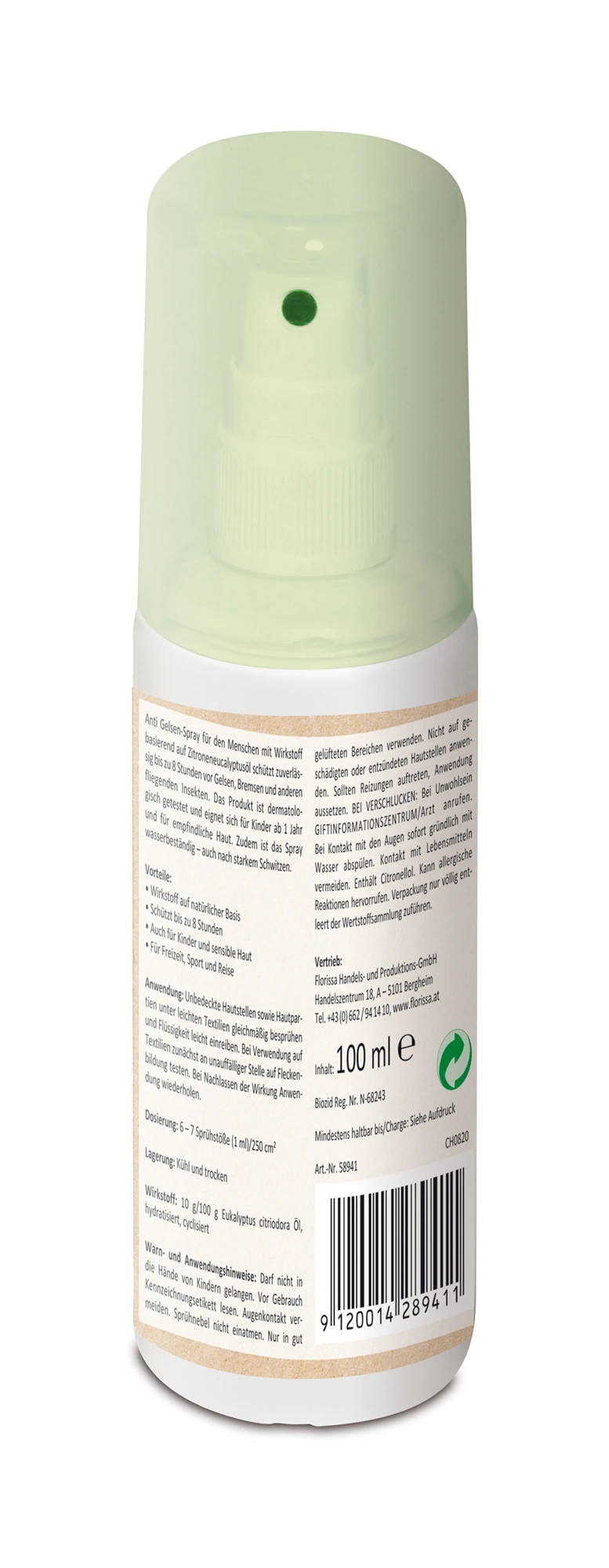 Anti Gelsen-Spray mit Wirkstoff basierend auf Zitroneneucalyptusöl schützt zuverlässig bis zu 8 Stunden vor Gelsen, Bremsen und anderen fliegenden Insekten. Das Produkt ist dermatologisch getestet und eignet sich für Kinder ab 1 Jahr und empfindliche Haut. Zudem ist das Spray wasserbeständig – auch nach starkem Schwitzen.