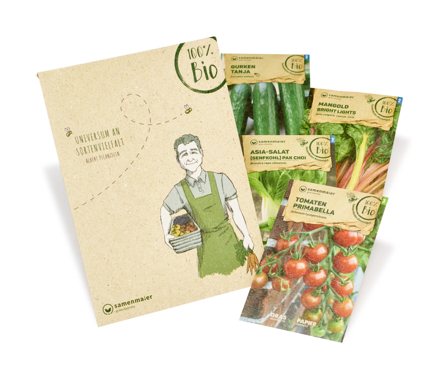 Exorbitant: Die samenfesten Bio Samen im Set sind nachhaltig in Graspapier verpackt und transparent bis zum Landwirt.