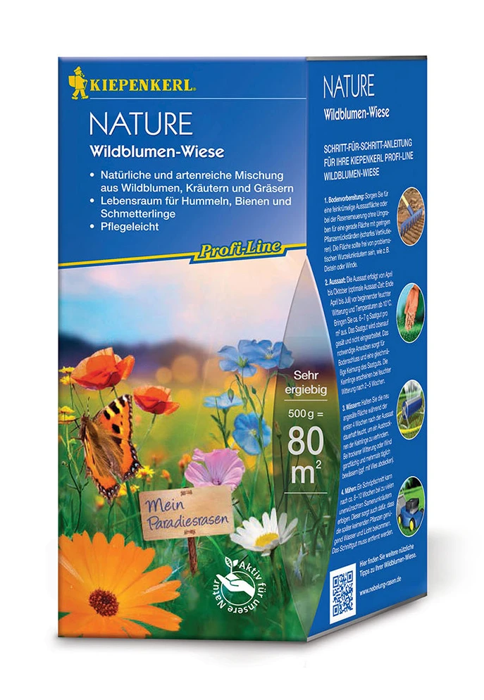 ProfiLine Nature. Natürliche und artenreiche MIschung aus Wildblumen, Kräutern und Gräsern. Lebensraum für Hummeln, Bienen und Schmetterlinge. Pflegeleicht. Geringe Aufwandmenge: nur 6-7 g/m². Reicht für ca. 80 m².