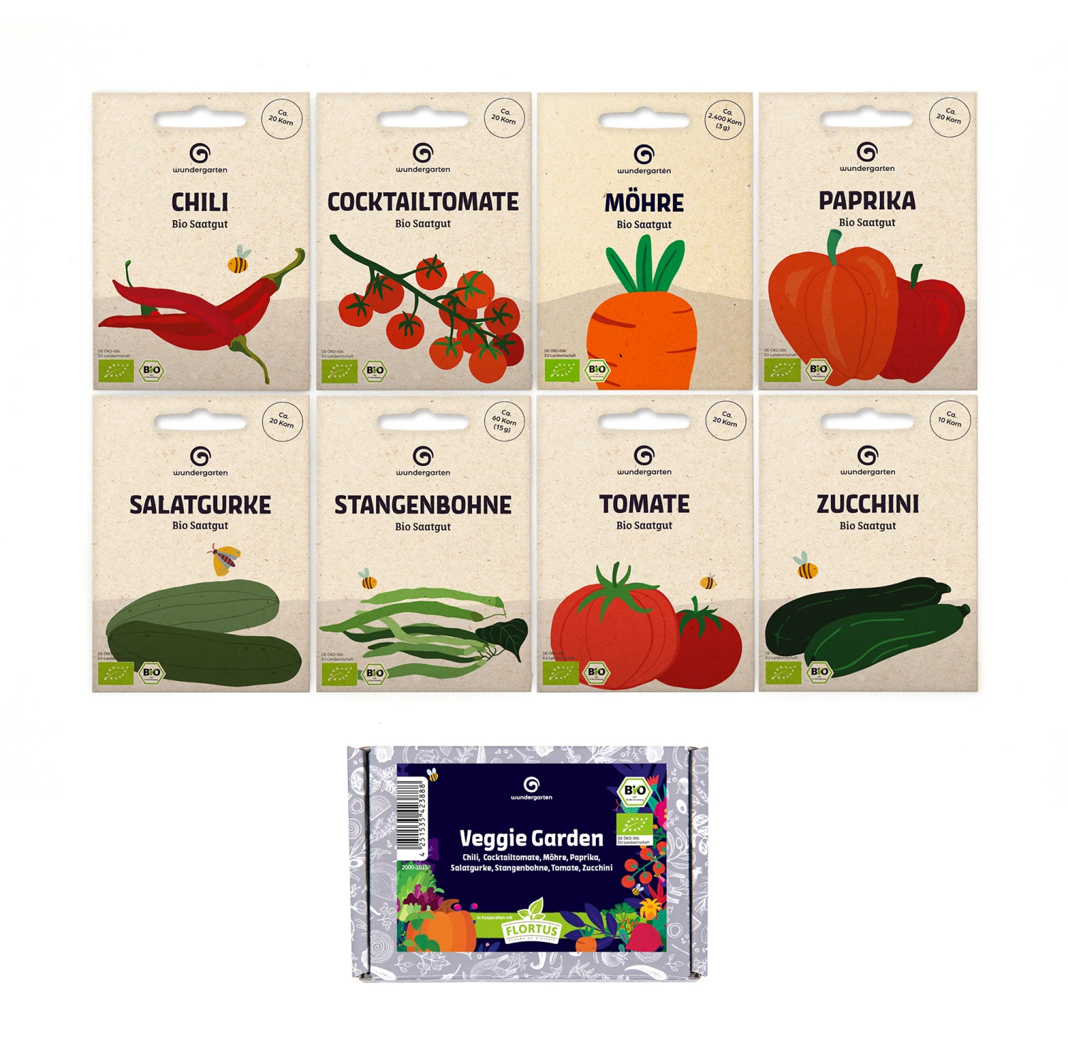 Das Samenset beinhaltet eine bunte Mischung mit leckerem Gemüse. Der Inhalt reich von Cocktailtomaten bis Zucchini. Acht tolle Gemüsesorten, die Sie übers Gartenjahr ernten können. Während Sie einige Gemüsesorten wie Tomaten, Gurken, Paprika und Zucchini bereits zeitig vorziehen sollten, können Sie Gemüsearten wie Möhren und Bohnen gleich an Ort und Stelle im Freien aussäen. Aus den aromatischen Gemüsesorten lassen sich zahlreiche Gerichte kreieren. Oder Sie naschen die Früchte einfach frisch aus dem Garten. Das Veggie Garden Set können Sie auch auf Balkon und Terrasse in Pflanzkübeln anbauen.